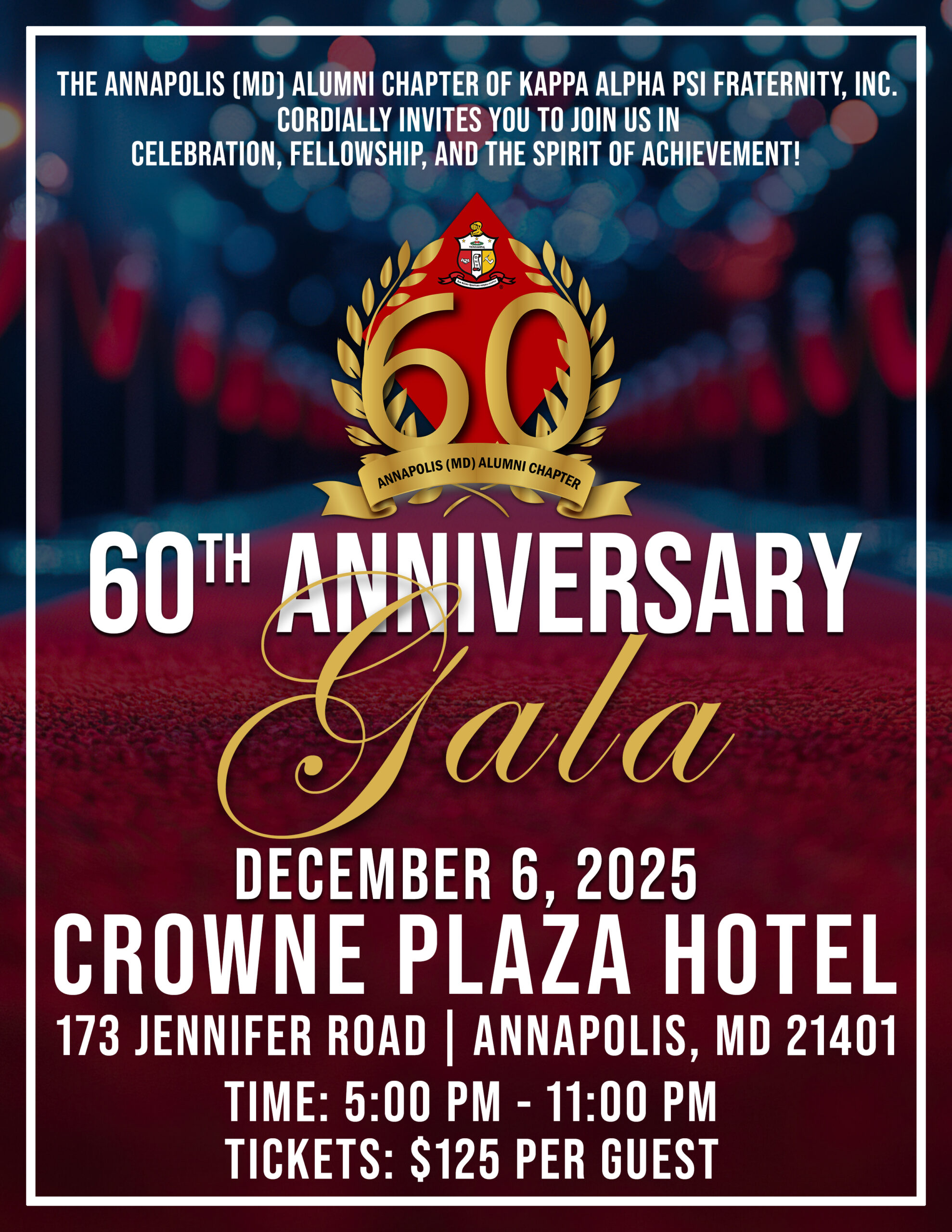 60th Anniversary Gala Please join Annapolis Alumni Chapter of Kappa Alpha Psi Inc. in their 60th Charter Day celebration. + Add to Google Calendar + iCal / Outlook export 00 days 00 hours 00 minutes 00 seconds Date Dec 06 2025 Time 7:00 pm - 11:00 pm Share this event
